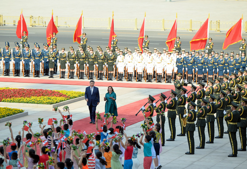 6月28日下午,国家主席习近平在北京人民大会堂同来华进行国事访问的秘鲁总统博鲁阿尔特举行会谈。这是会谈前,习近平在人民大会堂东门外广场为博鲁阿尔特举行欢迎仪式。新华社记者 丁林 摄