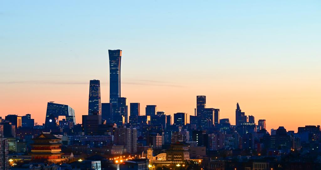 2025年11月27日清晨拍摄的北京正阳门城楼、正阳门箭楼和远处的CBD建筑群。新华社记者 陈晔华 摄