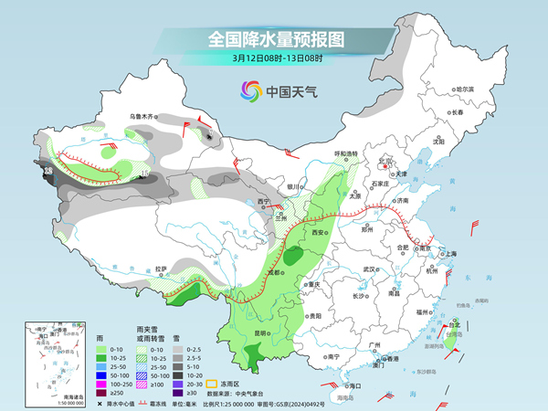 后天,内蒙古东北部和中部、新疆沿天山地区和南疆山区、西藏西部和南部、甘肃大部、青海北部和东部等地部分地区有小到中雪或雨夹雪,其中,新疆东部和南疆山区等地部分地区有大到暴雪。新疆南疆盆地、西藏东南部、川西高原东部、陕西、四川盆地中西部、贵州西部、云南、台湾岛等地部分地区有小雨,局地有中雨。