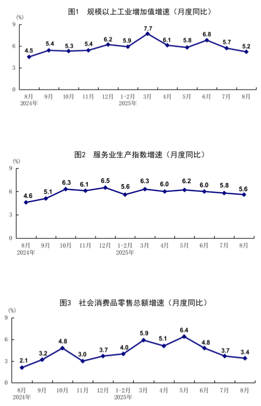 8月份,社会消费品零售总额39668亿元,同比增长3.4%;环比增长0.17%。按经营单位所在地分,城镇消费品零售额34387亿元,同比增长3.2%;乡村消费品零售额5281亿元,增长4.6%。按消费类型分,商品零售额35172亿元,增长3.6%;餐饮收入4496亿元,增长2.1%。基本生活类和部分升级类商品销售增势良好,限额以上单位日用品类、粮油食品类、体育娱乐用品类商品零售额分别增长7.7%、5.8%、16.9%。消费品以旧换新政策效果继续显现,限额以上单位家具类、家用电器和音像器材类、文化办公用品类、通讯器材类商品零售额分别增长18.6%、14.3%、14.2%、7.3%。1—8月份,社会消费品零售总额323906亿元,同比增长4.6%。全国网上零售额99828亿元,同比增长9.6%。其中,实物商品网上零售额80964亿元,增长6.4%,占社会消费品零售总额的比重为25.0%。1—8月份,服务零售额同比增长5.1%。其中,文体休闲服务类、旅游咨询租赁服务类、交通出行服务类零售额较快增长。