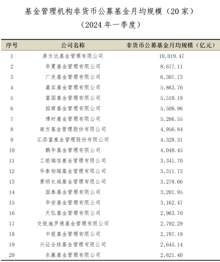 2024年一季度非货币公募基金月均规模前20名出炉。中国基金业协会最新数据显示,易方达基金、华夏基金、广发基金排在前三名,管理规模依次为10019.47亿元、8677.11亿元、6307.73亿元。