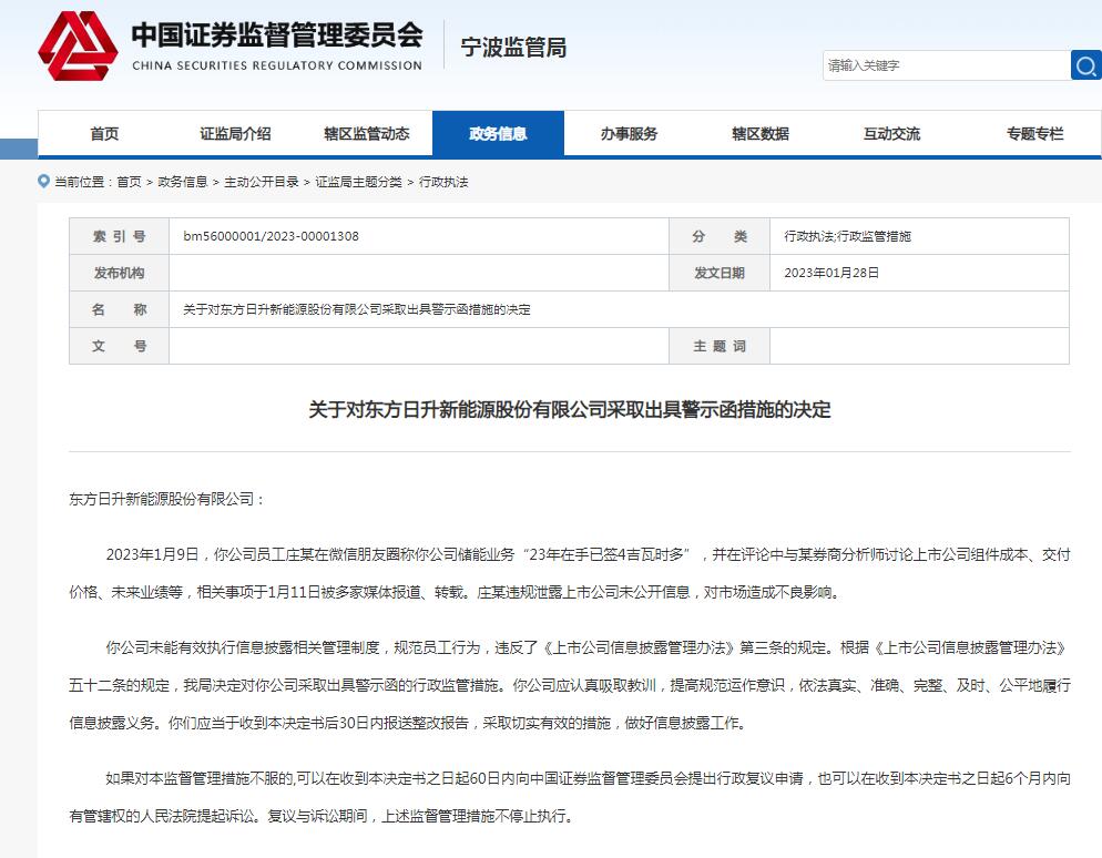 宁波证监局网站近日发布《关于对东方日升新能源股份有限公司采取出具警示函措施的决定》。