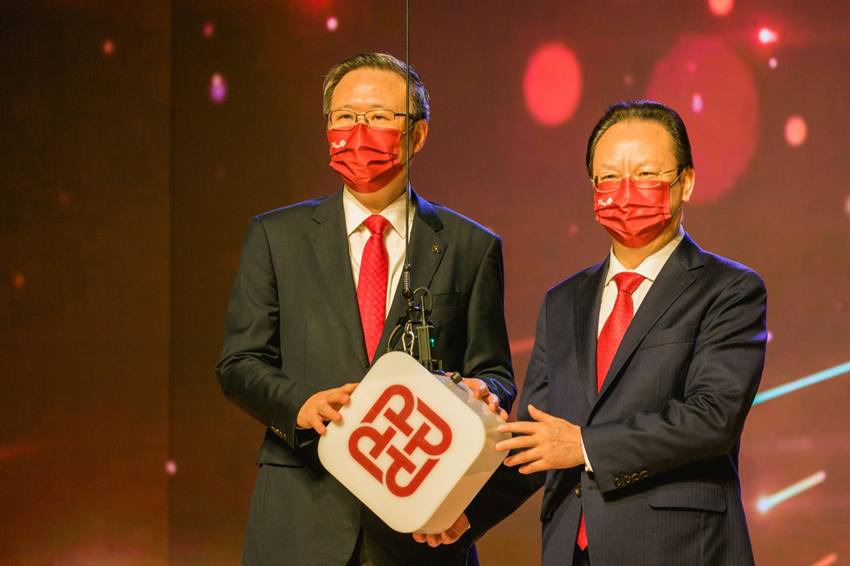 中央人民政府驻香港特别行政区联络办公室副主任谭铁牛院士(右)与香港理大校长滕锦光教授出席庆祝香港理大八十五周年校庆启动仪式。