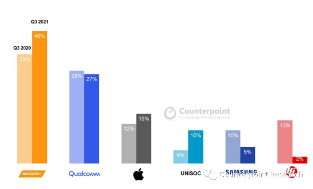 Counterpoint全球手机AP/SoC 2021Q3出货量市场份额,联发科再次夺冠(图片来自网络)