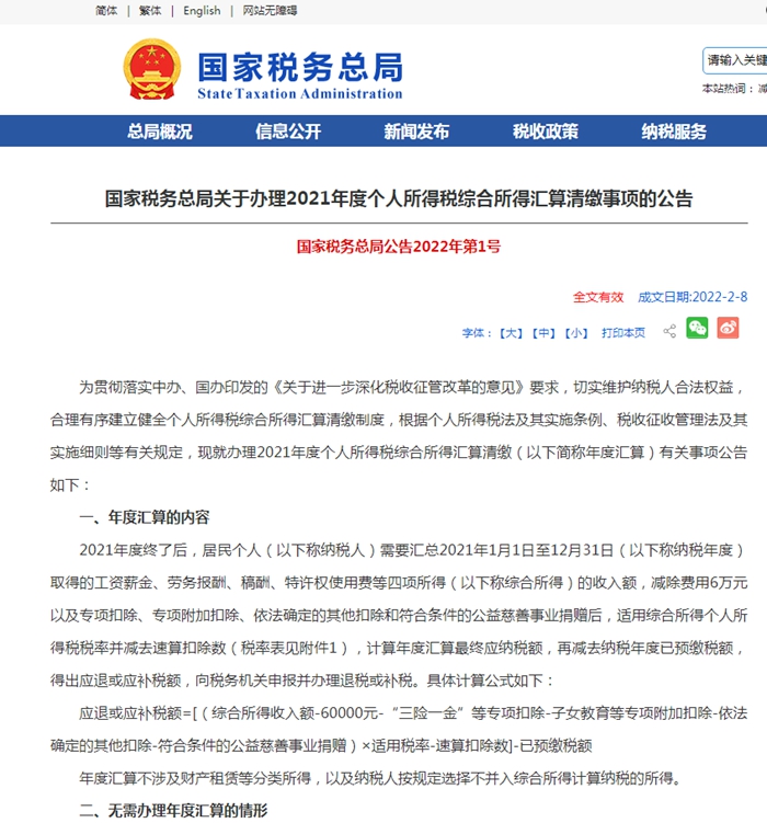 国家税务总局关于办理2021年度个人所得税