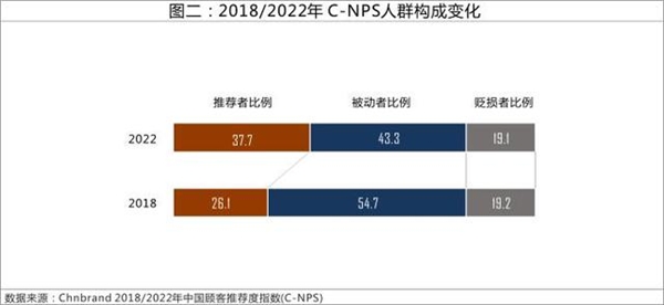 C-NPS报告中显示,2022年中国消费者中被动者比例相对2018年下降了11.4%,而推荐者人群比例从2018年26.1%增加到2022年37.7%。