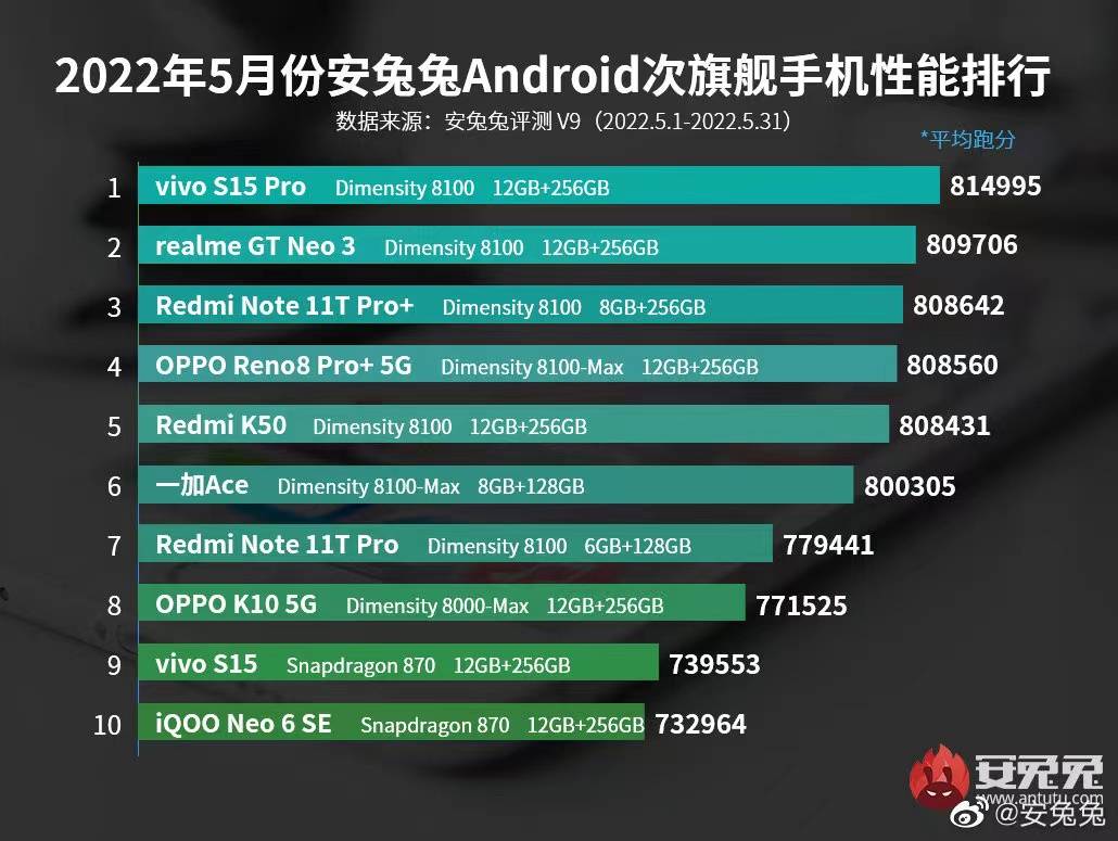 2022年由于天玑9000和天玑8100、天玑8000芯片的出现,手机市场出现了很多兼顾性能、能效的手机。最近,安兔兔发布5月安卓手机性能排行,搭载天玑9000的vivo X80平均跑分为1013845,稳居第四名;而vivo X80 Pro天玑9000版也获得超百万跑分成绩,位列榜单第七名,旗舰市场再也不是高通一家独大的时代了。