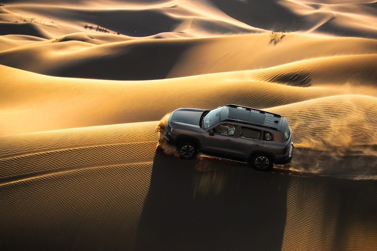 去到库布齐沙漠,要怎么玩才有新意?比起滑沙、骑骆驼,不如来场惊险刺激的沙漠越野!沙漠越野之所以吸引人,正是在于其集烈日、酷热、干旱、沙暴、狂风,于一体的属性。在山势变化复杂的沙山中穿行,对车辆性能、通过性、发动机耐热性等提出了巨大的考验,若是没有强大的越野能力和经验,随时有翻车危险。