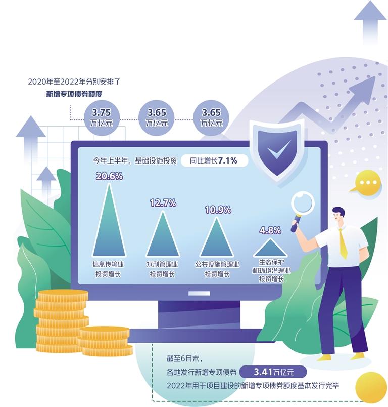 专项债券在带动扩大有效投资、稳定宏观经济大盘等方面发挥着重要作用。今年我国安排新增专项债券额度3.65万亿元。最新统计显示,截至6月末,各地发行新增专项债券3.41万亿元,2022年用于项目建设的新增专项债券额度基本发行完毕,比以往年度大大提前,拉动有效投资规模持续扩大。