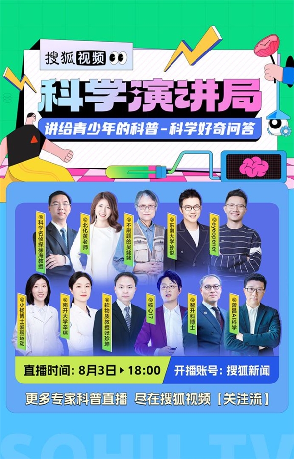 暑假总是青少年们激发好奇心、探索未知的好时机,科学的发展,依靠的不仅是前人的奋斗不息,更需要无数有志青年的开拓进取。在2023年夏天的暑期档,搜狐视频科学演讲局上线新一期直播活动《将给青少年的科普——科学好奇问答》,邀请各位科学达人为广大青少年所好奇的问题进行答疑解惑。本次科学演讲局将于8月3日18:00在搜狐视频APP开启上线,分为【动动脑瓜,还原你的天马行空】与【直播实验,解答你的奇思妙想】两个环节,另外还有结尾彩蛋小视频,用户只需打开搜狐视频APP,进入“关注流”,便可观看精彩直播内容。