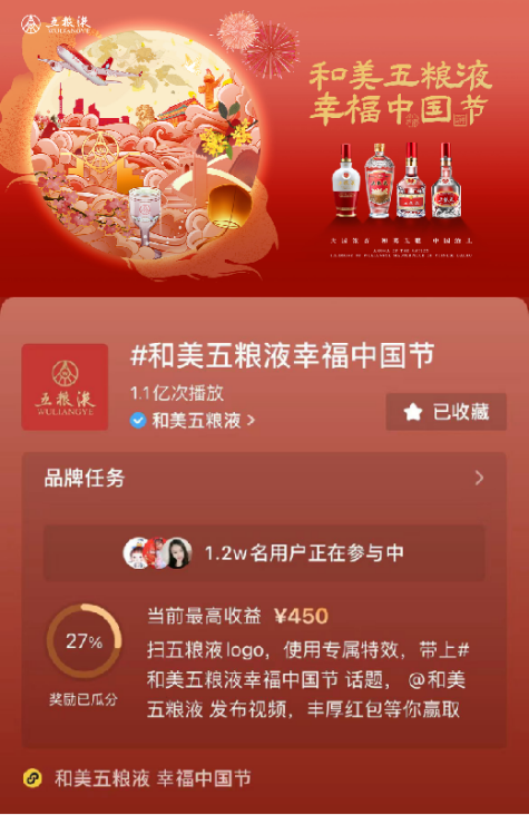 随着中秋、国庆双节临近,由五粮液发起的“#和美五粮液幸福中国节”抖音挑战赛在持续升温。截至发稿,该挑战赛视频总播放量已超过1.1亿次,吸引了1.2万名用户参与,在抖音平台上掀起一股和美热潮,将节日氛围烘托的更加火热!