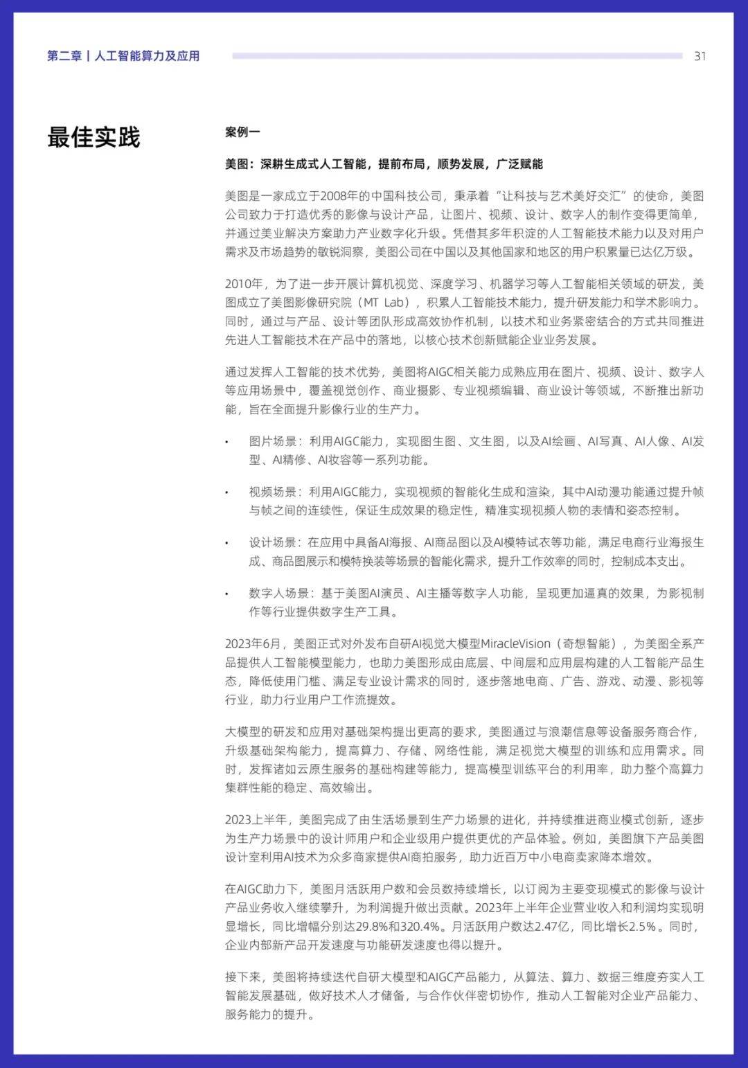 《报告》表示,美图自主研发的AI视觉大模型MiracleVision配合美图自建的美学评估系统,不仅能够为用户提供全面的影像处理解决方案,还可有效提升工作流效率,从而为电商、广告、游戏、动漫、影视等行业带来新的发展机遇。美图推出的“影像生产力全家桶”已应用于AI图片、AI视频、AI设计、AI数字人四大领域,并取得了亮眼的成绩。