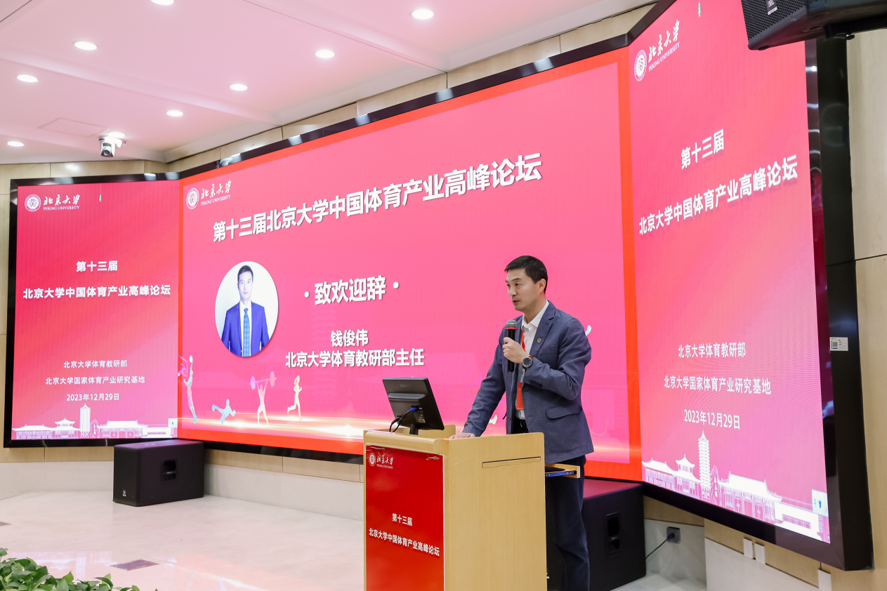 上午8:30,论坛开幕式开始,北京大学体育教研部主任钱俊伟教授首先致欢迎辞,他对出席论坛的各位领导、嘉宾和媒体表示了热烈欢迎,希望通过指出北京大学体育产业高峰论坛这一品牌活动,进一步推动体育产业的发展,加强与国内外体育产业各 关联领域的联系,加速体育产业科研成果转化落地。他还倡导各位嘉宾和专家学者在本次论坛上畅所欲言、共同探讨体育产业发展的新思路和新方向。