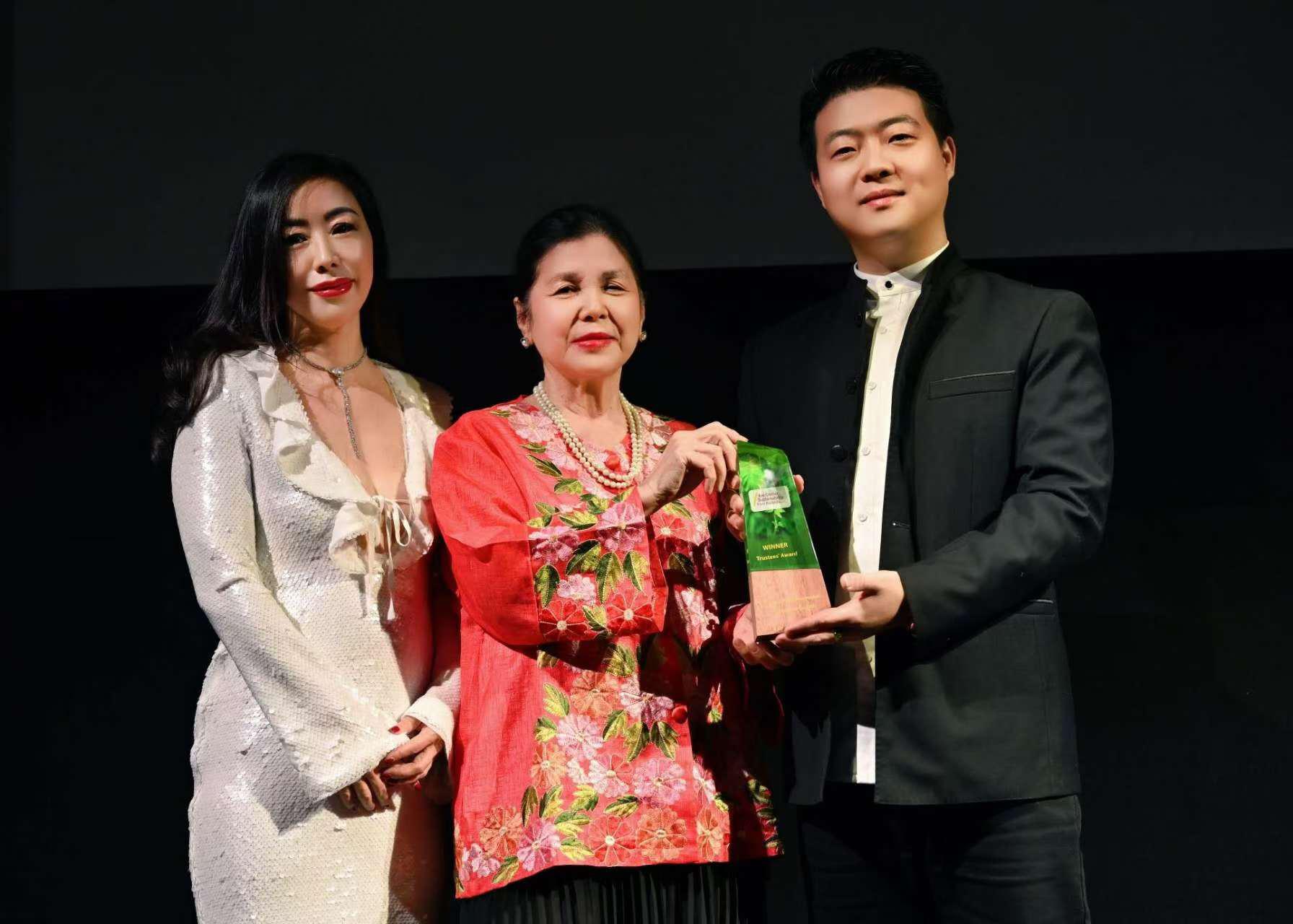 图为TVE全球可持续发展电影奖主席Mei Sin OBE(中)、亚太地区荣誉主席Helen Wang(左)向出品人兼编剧王钦甲(右)颁发本届英国TVE全球可持续发展电影奖“评审团特别奖”。