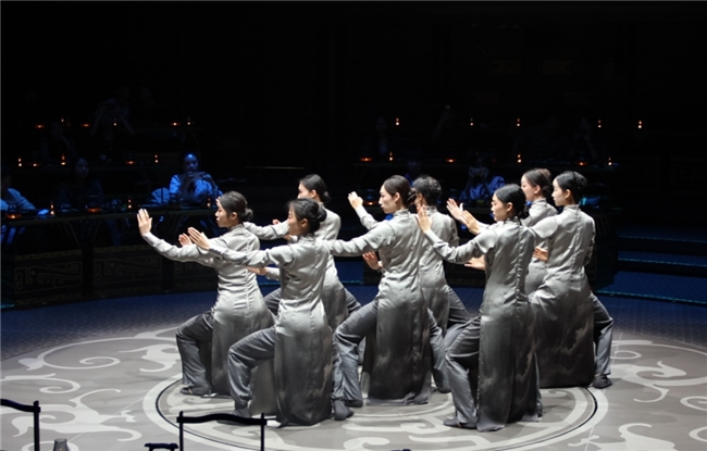 更令人拍案叫绝的是,这里的每一道菜都是舞台表演的 “剧本”。当演员们身着锦绣华服,在光影交织的纱幕间重现 “胡服骑射” 的豪迈、“完璧归赵” 的惊险 时,餐桌上的佳肴竟与剧情遥相呼应:随着蔺相如 “持璧而立”,餐盘里的 “琥珀炆玉环” 也泛起温润光晕;而当舞者在《刚柔并济》的乐声中,以太极招式舒展身姿,黑白交织的绸缎如阴阳鱼流转,餐盘里太极八卦造型的龟苓膏,表层黑亮的焦糖纹路与乳白椰奶泾渭分明 。不少食客感叹:“这哪是吃饭?分明是参演了一场穿越剧!”