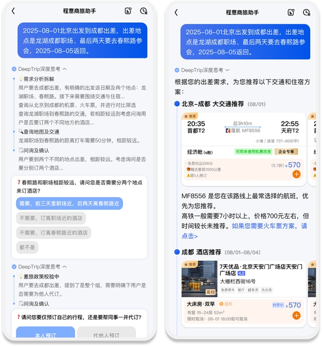 同程商旅作为一站式企业级服务平台,始终致力于在现有产品服务体系上持续精进,通过系统性升级资源网络与管控能力,为企业构建更稳固的差旅管理基础。与此同时,我们正通过深层AI技术实现智能跃迁,以“对话即预订”的自然交互和智能风控,将差旅管理从成本管控推向价值创造的新高度。我们期待以“资源+AI”的双轮驱动,成为企业数字化进程中不可或缺的合作伙伴。