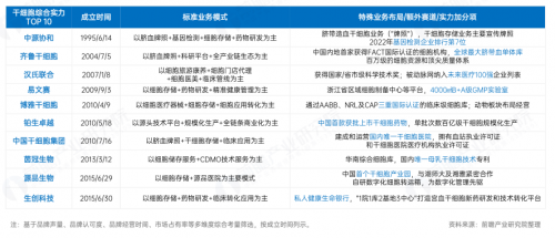 随着监管体系逐步完善、资本持续涌入、技术不断突破,干细胞行业竞争的核心维度也从资源卡位延向技术、转化、商业化能力的综合比拼,赛道内企业排位正在迎来新一轮洗牌。可以看到当前已逐步形成较为明确的品牌格局,头部企业多为老牌企业,随经验积累建立起较高的行业技术壁垒,例如,中源协和是国内干细胞A股上市领头公司;齐鲁干细胞依托资源库着力打通上中下游产业链;但也不乏快速突围的后起之秀,如源品生物、生创科技、中盛溯源等。