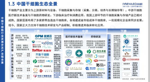 聚焦我国当前的干细胞生态全景,沿全产业链价值逻辑全产业链可分为上、中、下游三大板块:上游立足原材料设备与细胞采集存储,筑牢产业资源底座;中游深耕医疗新技术备案与干细胞药物研发,夯实技术核心竞争力;下游落地临床治疗与健康消费应用,实现产业最终价值交付,全链条协同联动、深度共生。